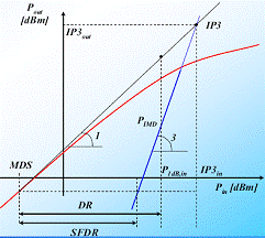 Spurius Free Dinamic Range individua il range dinamico libero da spurie a tal fine viene individuato il valore del livello di rumore ed il valore del segnale d'ingresso per il quale la potenza dovuta all'intermodulazione del terzo ordine emerge di 3dB dal rumore, si ha :