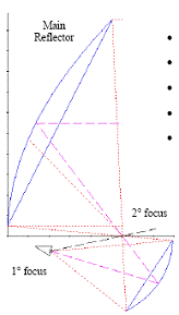 Antenne 1) Antenna Cassegrain : Il fuoco illumina un subriflettore il quale a sua volta illumina il riflettore principale.