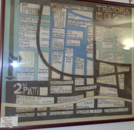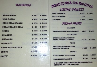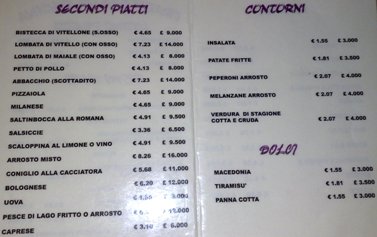Alla fine optiamo per 2 antipasti all'italiana (buoni), strozzaprete e spaghetti all'amatriciana o alla carbonara (buoni), patatine (forse troppo fritte), carne (..un pò dura), caffè (lungo e un pò insapore) ... vino particolare, non direi buono, direi particolare.