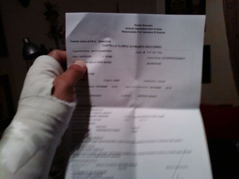 la sfiga quando ci si mette.... venerdì sera rimonto sullo scooter e parto, solo che mi ero scordato di togliere il bloccadisco (non lo uso mai quindi non sono abituato). morale, lo scooter si pianta di botto e io per non farlo cadere faccio uno sforzo improvviso con le braccia. il polso sinistro deve averne risentito parecchio. pronto soccorso: niente di rotto, forte infiammazione del tendine che si è indurito al punto da scrocchiare.