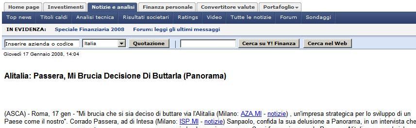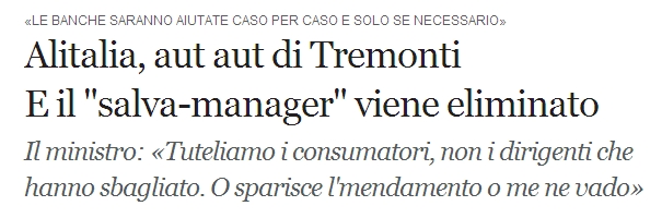 Dopo quello che ho visto su Parmalat (...si è creata una nuova azienda col nome e i beni della vecchia Parmalat, e la si è quotata in borsa, e pure in attivo, mentre esisteva anche una vecchia Parmalat fallita ed ai cui azionisti sono state lasciate in mano azioni a valore 0) insomma son curioso di vedere cosa si riesce a fare per Alitalia.