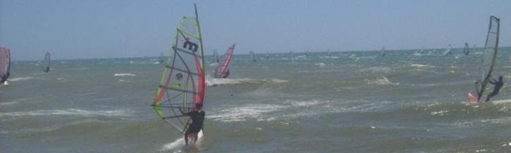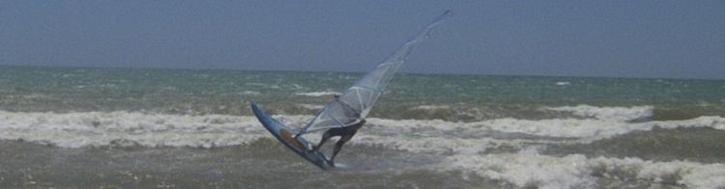 Vento c'è, l'esperienza fatta in Sardegna con le partenze da acqua via via più profonda funziona, però la partenza dall'acqua non va, non riesco a sistemare la vela bene, a farla alzar dal vento, ci riesco una volta sola, metto il piede su ed ecco, mi prende un crampo, per fortuna ancora tocco e vicino c'è un ragazzo che conosco, ma un pò mi spavento, rientro a terra e mi riposo.
