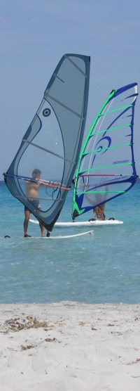 Anche a maggio però non è male, arriviamo qui da MurtaMaria, dove non avevamo trovato vento, da Roma Claudio con le sue mappe ci ha consigliato San Teodoro e, non sapendo che pesci prendere, siam venuti, vento zero, tanto che Walter e Sergio nemmeno montano, io e Giampiero non perdiamo un colpo, montiamo, ma stavolta è giusto un pò di palestra, in acqua facciam fatica a far 100 metri, decido di sfidarlo nella mia specialità, la navigazione con venti deboli, vinco io nonostante circa 0,5mq di vela in meno, ma c'è il trucco, lui col pinnone si è incagliato, eh si, qui l'acqua scende abbastanza lentamente, al ritorno, capitalizzata l'esperienza, vince lui.