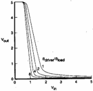 come si vede la caratteristica è quella di un inverter che effettua l´escursione massima e che ha una pendenza molto elevata o per meglio dire un guadagno elevato in corrispondenza del passaggio da basso ad alto.