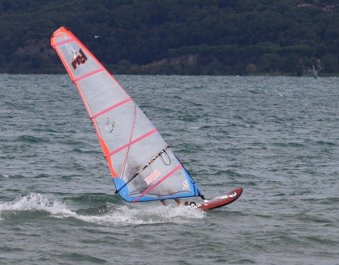 Arrivo verso le 10 con la mia biga insieme ad legionario incontrato sulla via Romana , becco un legionario con i capelli al vento , gli faccio i miei complimenti per il suo coraggio perchè aveva lottato la mattina contro venti barbari incazzati , che gli avevano spaccato in 2 pezzi il boma , gli presto uno che avevo di scorta per la gnagnarella e lui lo adatta e và via come un fulmine in acqua , ma in un primo momento senza trapezio , poi lo indossa e schizza via lontano tra le onde.. Dopo un pò mentre io sposto la biga di quà poi di là , perchè apre il brasiliano che mi prende 5 sesterzi , ma ben ripagati dalla comodità del luogo , incontro un 'altro legionario che vuole affrontare le ire del freddo e furioso vento senza un'adeguata protezione dalle spade gelide che lo trafigerranno a breve , senza che lui faccia una smorfia ..., mi sembrava Annibale , incredibile coraggio !. Nel frattempo mi sfila alle spalle già pronto un'altro eroe che si butta impavido nella mischia più furibonda tra gelide spade e barbari incazzati , lui a differenza degli altri monta una vela più grossa degli altri di mezzo metro perchè lui fà la differenza sempre .. infatti il suo cavallo stà più in aria che a terra , direi quasi come Pegaso.. , noto come l'altro legionario che anche lui aveva una corazza un pò meno sottile della mia , sempre per le gelide spade, forse una prova di coraggio per corazzare il proprio fisico ,cioè una metafora bella è buona , povero Eraclito chissà cosa penserà !!. Finalmente entro io di tutto punto , corazzato al punto giusto , sempre con il mio fido cavallo che mi concede pause , con un occhio sopra la testa per vedere se qualche barbaro mi offendeva alle spalle, faccio un pò di bordi su è giù , poi mi riposo bevendo la pozione magica rubata dall'antica Gallia che mi dona un energia sovraumana , purtoppo nel momento centrale della battaglia , la più cruenta raffiche a 32 knots catapulto dal mio cavallo e distruggo un albero che forse si poteva salvare . Infine arriva l'ultimo legionario che anche lui schizza via con il suo cavallo nelle onde del lago , sfidando non più i barbari ma dei msotri alati che svolazzano sula sua testa ... Roba da matti ! , dall'antica Roma al Fantasy in un batter di ciglia ...
