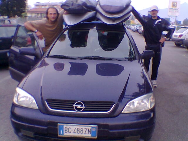 Venendo al dunque... alle 7 circa ci incontriamo al casello di Frosinone, facciamo colazione (cornetto e capuccino offerti fa SerFer), carichiamo l'Arena Mobile di 4 tavole, 3 bomi, non so quanti alberi e tanto meno quante vele, ma come al solito c'era un sacco di roba!