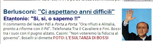 | Parlavi di Veltrusconismo se non sbaglio ... l'han detto e ridetto che non si farà, se basta il PDL si riunisce con Casini, al solito caro prezzo e non sarà cambiato niente ... aspetto fiducioso |