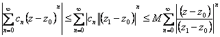 Essendo la serie convergente in z1 allora i suoi termini tendono a zero per n®¥ pertanto il termine generale può essere maggiorato da una costante M cioè e quindi si ha  ma noi siamo interessati a vedere se converge assolutamente la serie per un punto z tale che |z-z0|<|z1 - z0|  quindi prendiamo il modulo della serie di potenze  ma quest´ultima è una serie geometrica di ragione q<1 e pertanto è convergente quindi per il criterio del confronto la serie data converge assolutamente. Per dimostrare la convergenza uniforme si utilizza il criterio di Weierstrass che prevede la maggiorazione con una serie numerica convergente quale ad esempio può essere essendo r < |z1 - z0| .