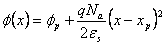 3) Giunzione PN all´equilibrio termico : Quando si mette a contatto un p_doped con un n_doped si ha una brusca variazione del drogaggio in corrispondenza della giunzione pertanto si ha un flusso di elettroni dalla regione n alla regione p ed un flusso di lacune in verso opposto, pertanto nelle regioni di provenienza rimangono degli ioni i quali generano un campo elettrico che si oppone all´ulteriore diffusione di carica. Per analizzare questa situazione si utilizza la approssimazione di quasi neutralità nel bulk e la approssimazione di Depletion nella regione di carica spaziale posta a ridosso della giunzione, in essa quindi l´equazione di Poisson si riduce a Integrando ulteriormente il campo si ottiene nell´n_doped il potenziale