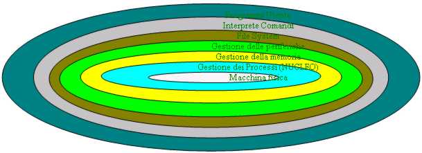 2) Come è organizzato il Sistema Operativo: È una struttura a strati anche detta a buccia di cipolla, nella quale ogni strato inferiore offre agli strati superiore una macchina virtuale disconnessa dalle particolari problematiche hardware, Gli strati in cui un Sysop è normalmente suddiviso sono esemplificati dalla seguente figura: