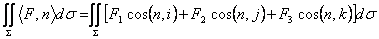 114) Formula della divergenza nel piano : Si ottiene anche questo dal teorema di Gauss Green ponendo P al posto di Q e -Q al posto di P ottenendo al primo membro l´integrale di superficie di una divergenza e al 2° membro la circuitazione del prodotto scalare tra il vettore F ed il versore normale uscente. In formule si ha :