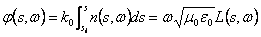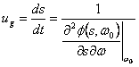 | Dispersione 1) Velocità di fase e di gruppo di un campo quasi monocromatico: Considerando presente il solo termine dominante E0(s) nello sviluppo di Luneburg-Kline e supponendo che sia reale, si ha che l'espressione del campo in funzione del tempo e di s è 2) Condizione di uguaglianza tra velocità di fase e di gruppo : Uguagliando velocità di fase e velocità di gruppo e portando i denominatori al numeratore del membro opposto, si ottiene