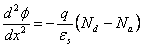 3) Giunzione PN all´equilibrio termico : Quando si mette a contatto un p_doped con un n_doped si ha una brusca variazione del drogaggio in corrispondenza della giunzione pertanto si ha un flusso di elettroni dalla regione n alla regione p ed un flusso di lacune in verso opposto, pertanto nelle regioni di provenienza rimangono degli ioni i quali generano un campo elettrico che si oppone all´ulteriore diffusione di carica. Per analizzare questa situazione si utilizza la approssimazione di quasi neutralità nel bulk e la approssimazione di Depletion nella regione di carica spaziale posta a ridosso della giunzione, in essa quindi l´equazione di Poisson si riduce a Integrando ulteriormente il campo si ottiene nell´n_doped il potenziale