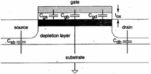In particolare la capacità del gate è Cg = Cgb + Cgs + Cgd dove Cgs e Cgd sono intese tra il gate ed il canale quindi se quest´ultimo è assente sono assenti anche esse pertanto a seconda della regione di funzionamento del MOS si ha: a) interdizione : il canale è assente quindi l´unica capacità è Cgb data dalla serie di C0 e Cdep b) non-saturazione : il canale è formato pertanto Cgb = 0 mentre c) saturazione : il canale non è formato dal lato del drain quindi Cgd = 0 mentre Al fine di calcolare i ritardi nei circuiti digitali si può approssimare Cg = C0 .
