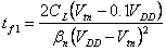 Evidentemente quindi il calcolo del tempo di discesa si suddivide in due fasi, una nella quale l´nMOS è in saturazione (…Si risolve per separazione delle variabili l´equazione (…con l´espressione della IDS per la regione di triodo ed integrando tra VDD – Vtn e 0.1VDD si ottiene Per quanto riguarda i tempi di ritardo essi sono semplicemente la metà dei rispettivi tempi di salita o di discesa e possono essere espressi nella forma