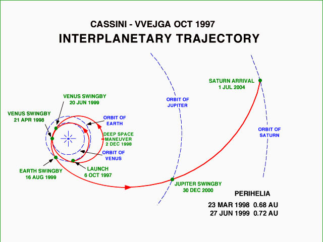 La sonda Cassini/Huygens è stata lanciata verso Saturno il 15 Ottobre 1997 mediante il razzo Titan IVB/Centaur dalla base di Cape Canaveral. Tale razzo ad elevata potenza si è reso necessario in quanto l´Orbiter Cassini pesa 2150Kg mentre il Probe Huygens 350Kg , sono inoltre stati imbarcati 3132 Kg di propellente che consentiranno alla sonda di raggiungere Saturno e di rimanere in orbita intorno ad esso almeno per 4 anni. La traiettoria seguita dalla Cassini è illustrata nella seguente figura , verranno sfruttati 4 diversi Flyby, nella fattispecie 2 con Venere, uno con la Terra ed uno con Giove, da notare poi che la antenna ad alto guadagno verrà diretta nella direzione del Sole con lo scopo di fungere da schermo al calore nel tratto in cui la sonda si trova a distanza inferiore dal Sole rispetto alla Terra.