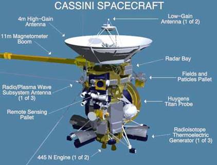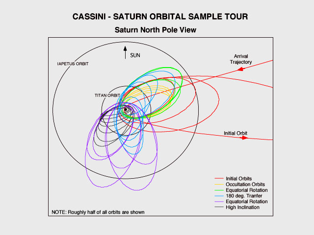 Date le enormi distanze dal Sole che Cassini deve raggiungere, non è possibile l´utilizzo di pannelli solari, si fa invece uso di RTG , Radioisotope Thermoelectric Generators i quali hanno dato luogo a numerose polemiche in fase di lancio in quanto viene utilizzato il decadimento naturale del plutonio per generare calore e quindi corrente elettrica. È interessante inoltre osservare che giunta a Saturno, Cassini si troverà a circa 9AU e quindi i segnali da essa inviati impiegheranno 70 minuti per giungere a Terra, ciò implica che non è possibile un controllo diretto della sonda. Il 6 Novembre 2004 si staccherà la Huygens Probe la quale ruotando su se stessa entrerà nella atmosfera di Titano dove collezionerà dati per circa 2,5 ore prima di raggiungere il suolo. L´Orbiter Cassini continuerà il suo viaggio nel sistema di Saturno per circa 4 anni sfruttando numerose volte Flyby con Titano, alcune delle orbite sono illustrate nella seguente immagine :