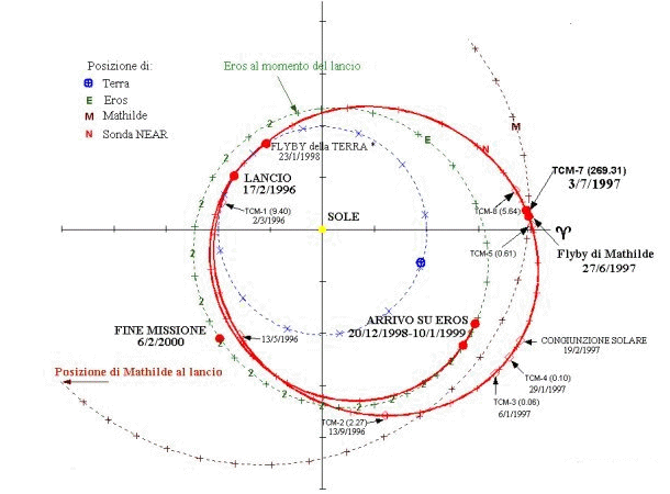 La missione Near Earth Asteroid Rendezvous (NEAR) è importante per diversi motivi tra i quali rilevanti sono i seguenti : a) E´ la prima missione del programma Discovery della NASA, un programma che si propone di realizzare missioni spaziali caratterizzate da un massimo di 3 anni di ciclo di sviluppo e costi inferiori ai 150 milioni di dollari comprendenti costruzione, lancio e 30 giorni di operatività, tali risultati vengono ottenuti focalizzando la attenzione su pochi obiettivi. b) È la prima sonda ad orbitare intorno ad un asteroide, Eros 433, ciò ne consentirà una mappatura precisa e completa sia topografica che chimica, in passato soltanto la sonda Galileo diretta a Giove aveva avuto la possibilità di fotografare da vicino due asteroidi, nella fattispecie Gaspra (il 29 Ottobre 1991) e Ida (il 28 Agosto 1993). NEAR è stata lanciata il 16 Febbraio 1996 con un razzo Delta, ha eseguito un flyby con la Terra per acquisire velocità ed uno con la asteroide Mathilde al fine di rilevarne alcune caratteristiche, il 20 Dicembre 1998 ha incontrato Eros 433 per poi entrare in orbita intorno ad esso. L´orbita seguita è riportata nella seguente figura : Dell´incontro con Matildhe ha stupito gli scienziati la presenza di crateri da impatto con 20 Km di diametro e circa 10-15 Km di profondità, si ritiene infatti che un meteorite capace di scavare un tale cratere avrebbe dovuto frantumare la asteroide inoltre a differenza di Ida e Gaspra, che hanno rivelato un periodo di rotazione di 7 e 4 ore, Mathilde gira su sé stessa in 17.4 giorni il che può essere giustificato da un fortissimo impatto meteorico che ha colpito la asteroide rallentando notevolmente la sua velocità. Classificazione degli asteroidiIl primo asteroide fu scoperto il 1° Gennaio 1801 da Giuseppe Piazzi, il suo nome è Cerere , in seguito ne sono stati scoperti molti altri tuttavia Cerere è il più grande avendo un diametro di 933km ed essendo formato dal 25% della massa di tutti gli asteroidi. Gli asteroidi sono classificati secondo vari tipi, in base ai loro spettri (e quindi alla loro composizione chimica) e al loro albedo: