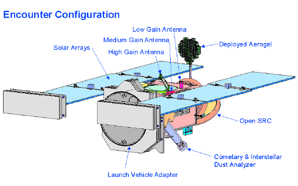Tale orbita consentirà di raccogliere sia polvere da Wild2 che particelle interstellari, in particolare verrà utilizzato lo stesso contenitore per entrambe, una matrice di alluminio composta da celle di 1000cm2 contenenti un materiale a bassissima densità chiamato Aerogel il quale verrà utilizzato per immagazzinare le particelle in modo che non vengano alterate, le sue proprietà sono infatti : a) costituito al 99,8% di aria b) isola 39 volte meglio del miglior isolamento in fibra ottica c) 1000 volte meno denso del vetro La matrice viene estratta dalla capsula SRC che verrà poi utilizzata per il rientro, da un lato si colleziona la polvere interstellare e dalla altro lato la polvere proveniente dalla cometa, per proteggere il corpo del satellite ed i pannelli solari da questa polvere ad alta velocità vengono utilizzati degli schermi che nella seguente figura sono disegnati in grigio :