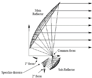 Antenne 1) Antenna Cassegrain : Il fuoco illumina un subriflettore il quale a sua volta illumina il riflettore principale.